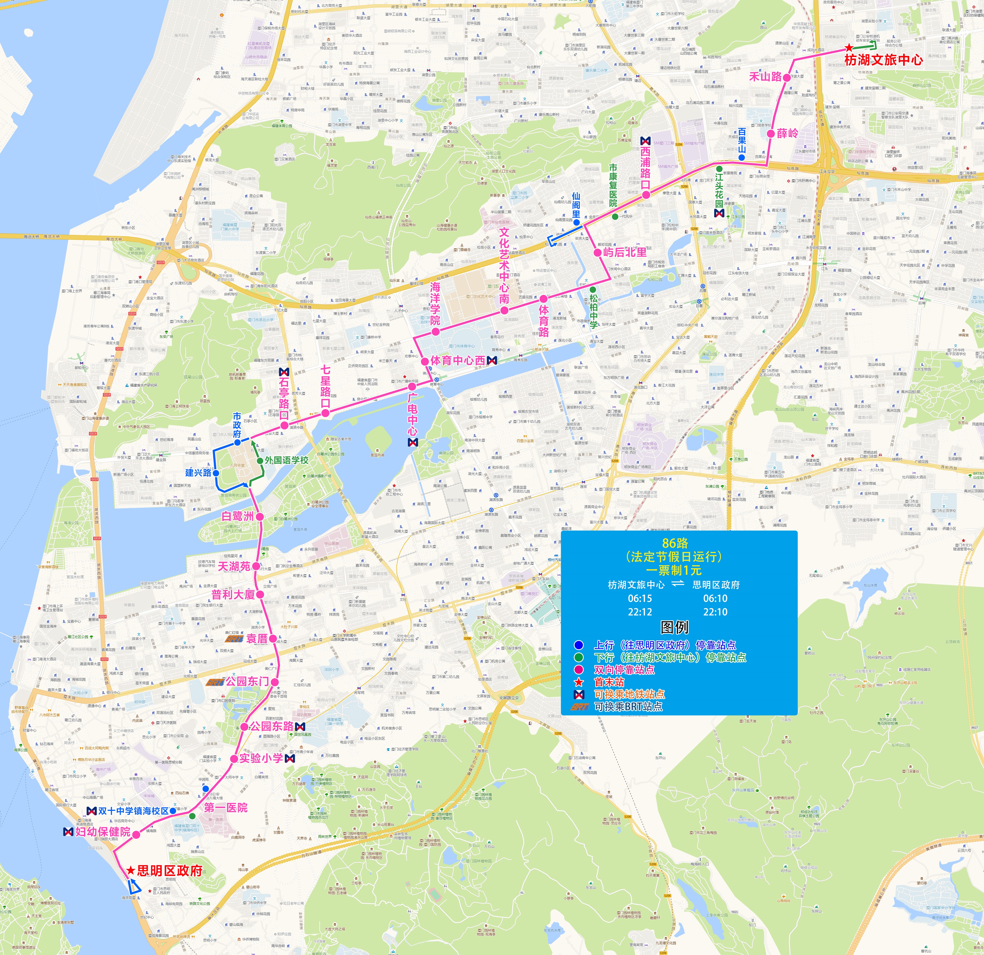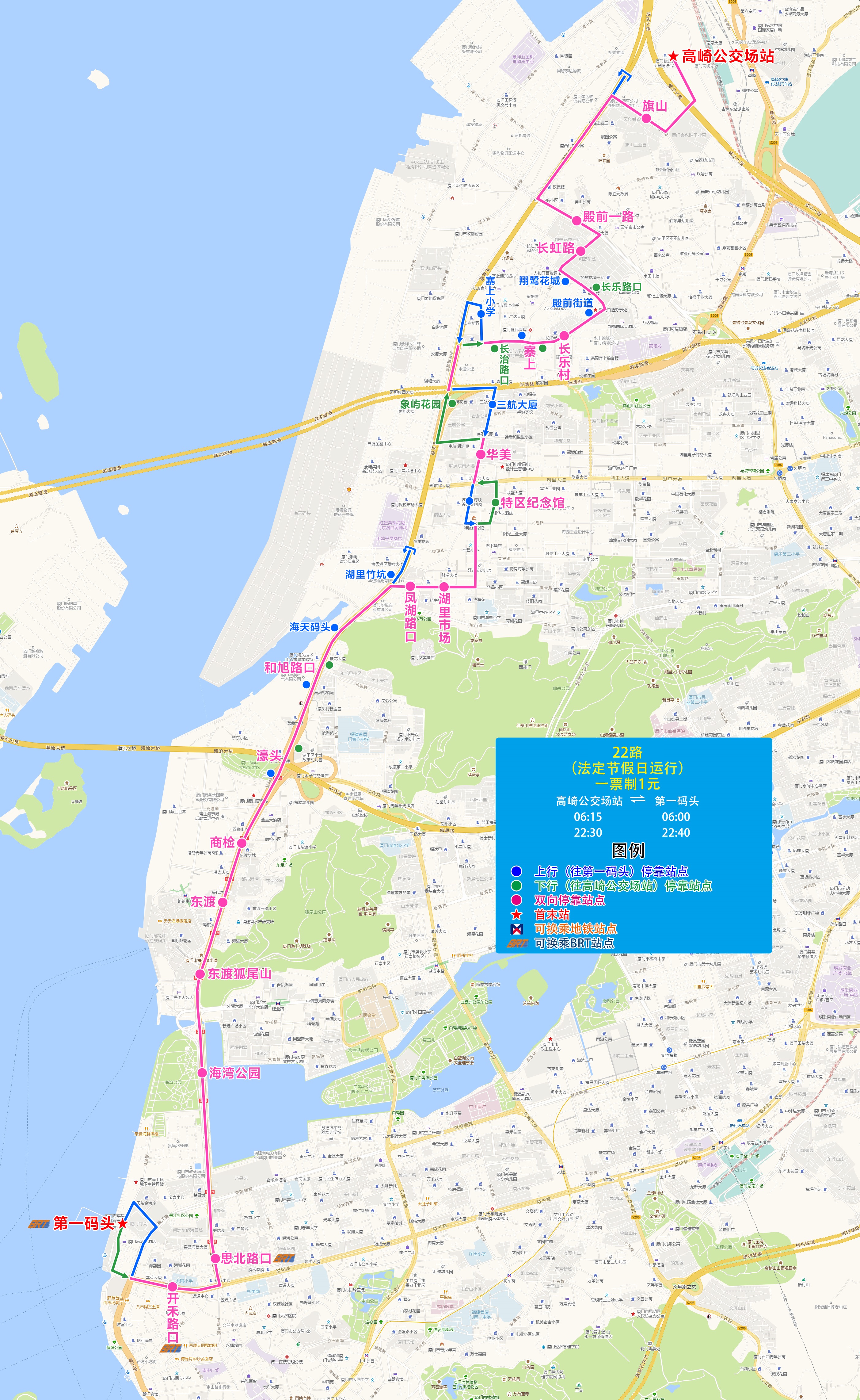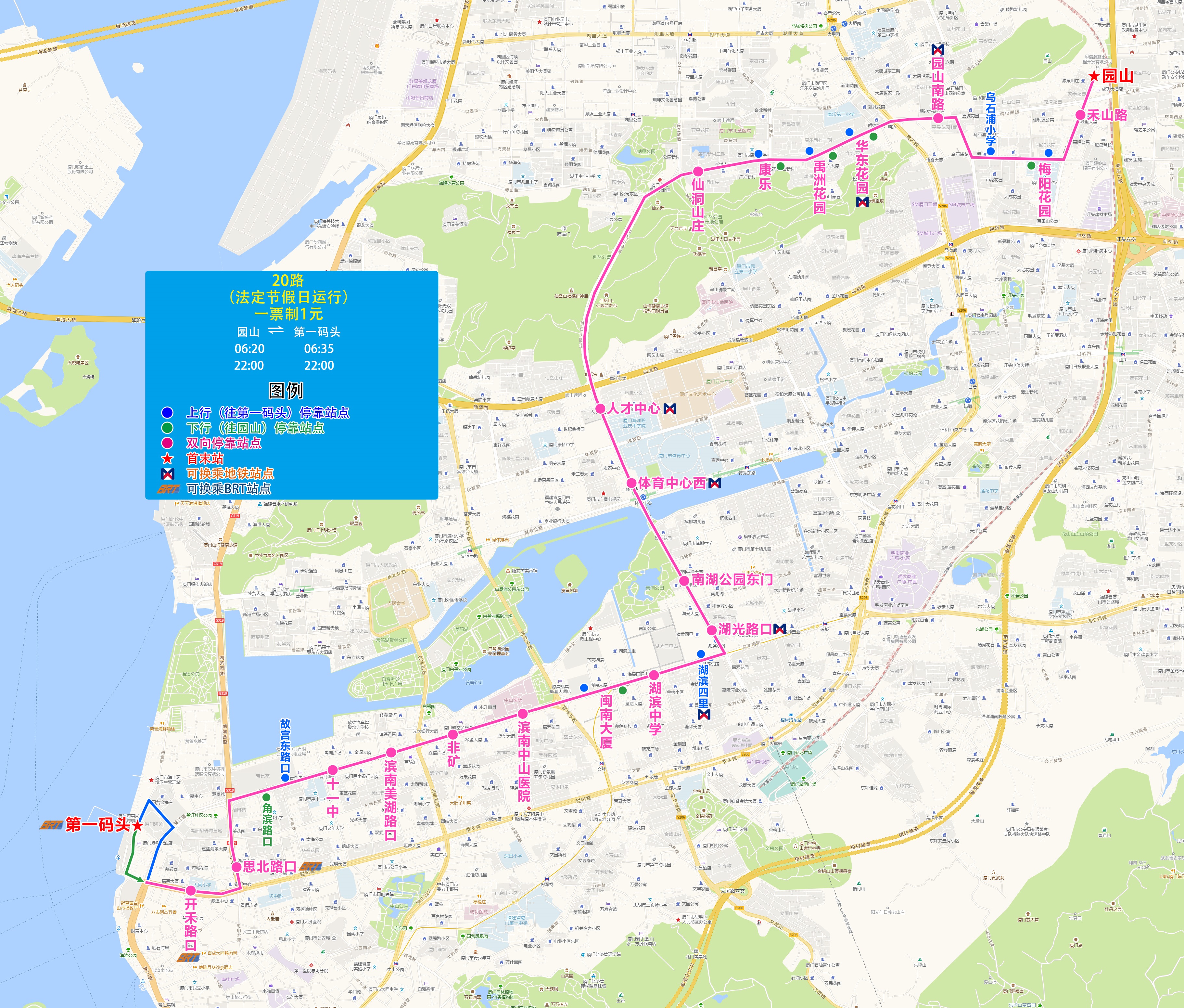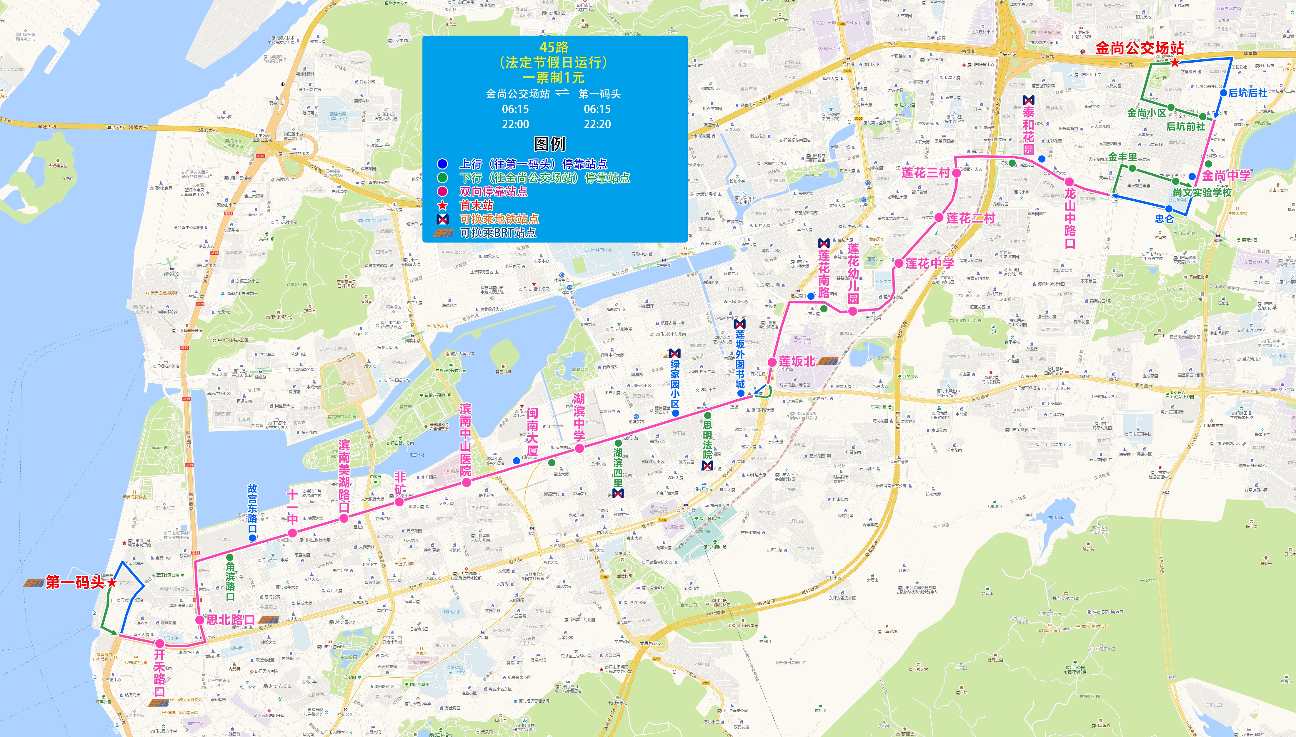 方便邮轮中心、植物园、南普陀、白鹭洲等景区乘客接驳地铁建业路站、中山公园站。