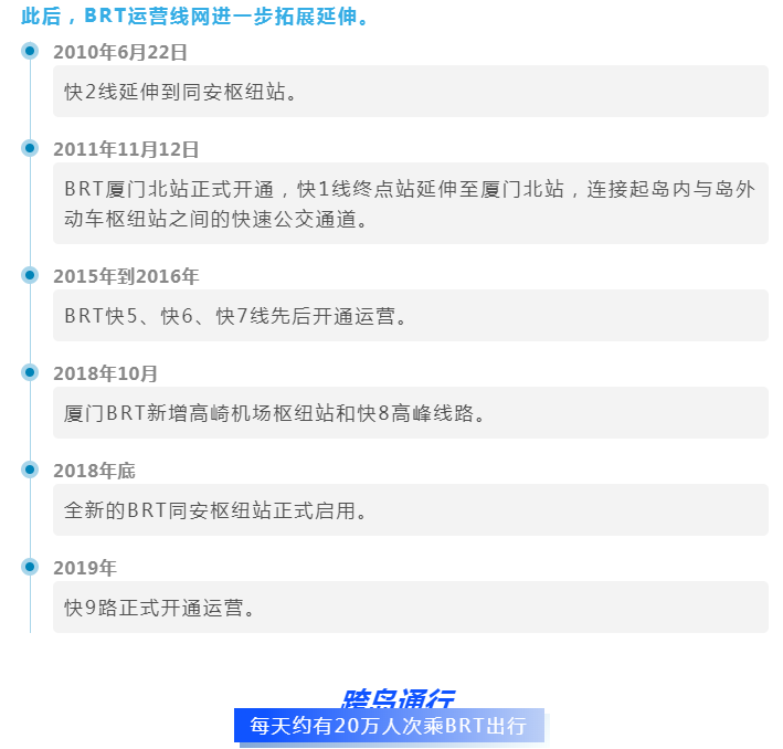 2008年,厦门BRT(快速公交系统)正式投入运营。作为跨岛发展的重要纽带,同时也作为全国首创的高架快速公交,厦门BRT实现对常规公交的升级,从根本上改变城市的交通结构,畅通岛内外路途,将高效通行的福利带给每一位乘客。