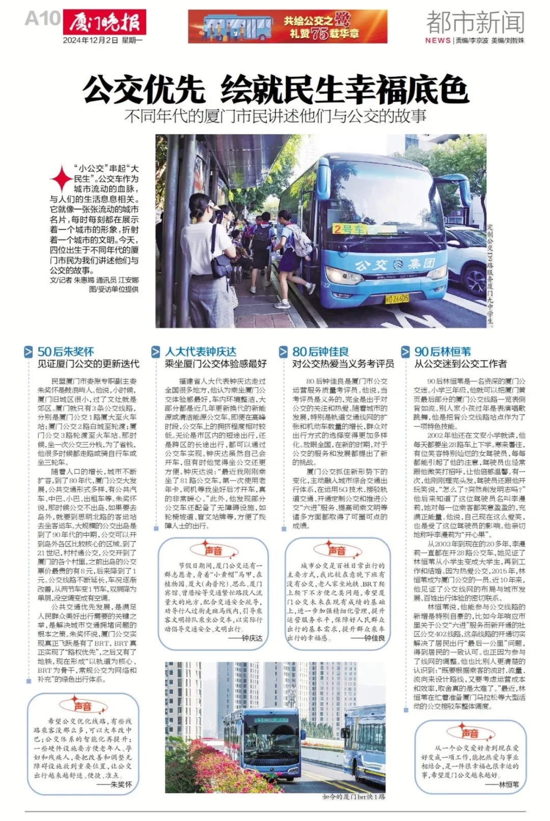 “小公交”串起“大民生”。公交车作为城市流动的血脉,与人们的生活息息相关。它就像一张张流动的城市名片,每时每刻都在展示着一个城市的形象,折射着一个城市的文明。现在,四位出生于不同年代的厦门市民为我们讲…