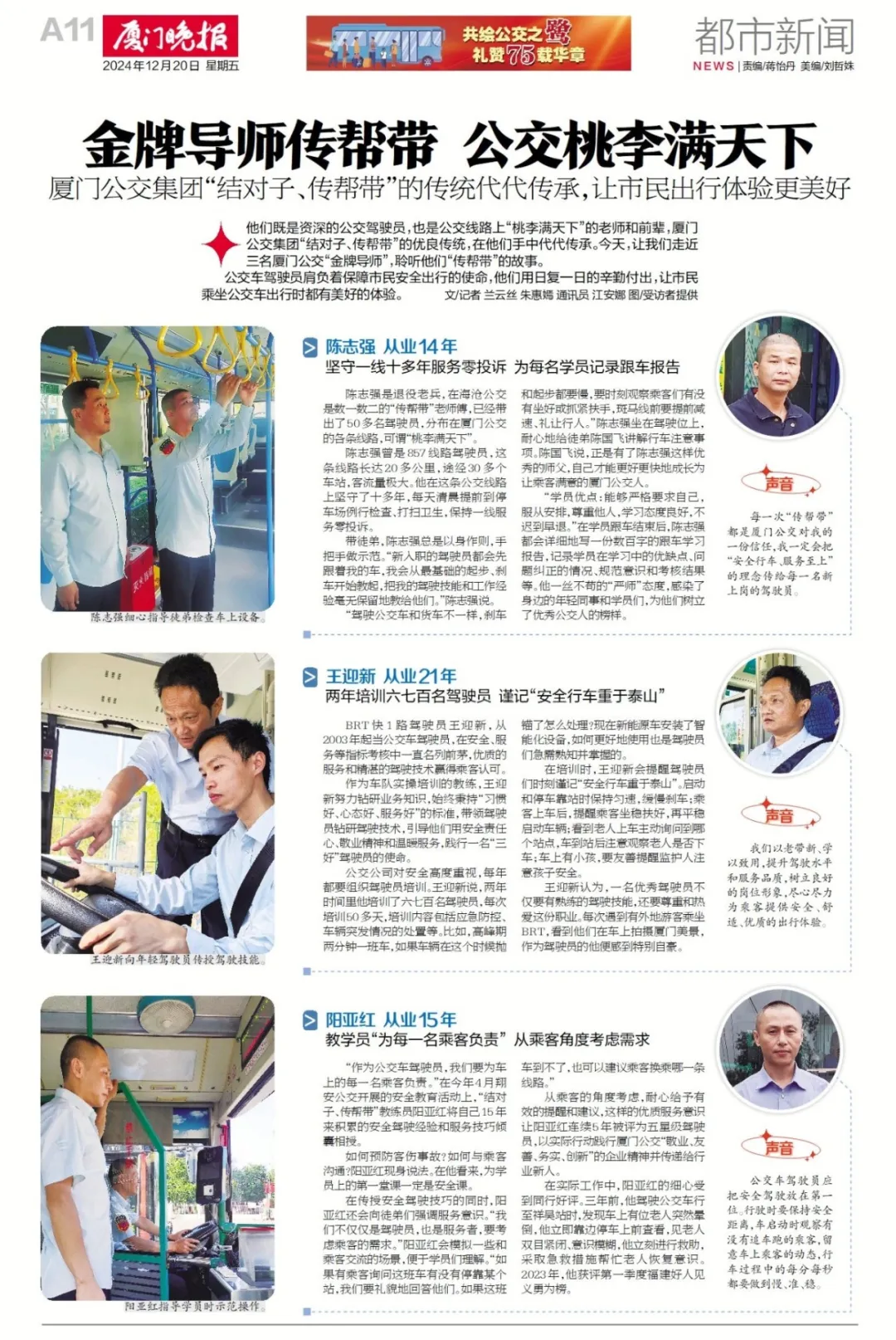 他们既是资深的公交驾驶员,也是公交线路上“桃李满天下”的老师和前辈,三级片 “结对子、传帮带”的优良传统,在他们手中代代传承。让我们走近三名三级片 “金牌导师”,聆听他们“传帮带”的故事。公交车驾…